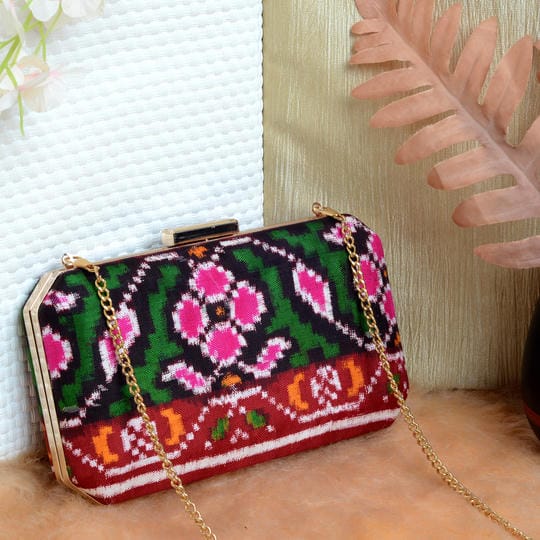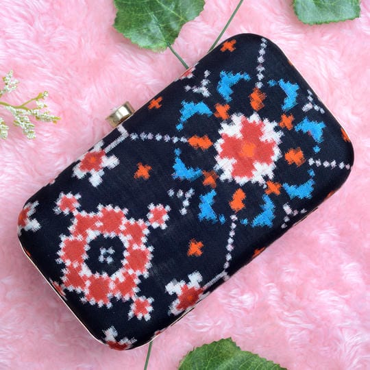 Design : Its in traditional Nau RatanClutch: Double Ikat Patola ClutchBase Color : Black Material...
