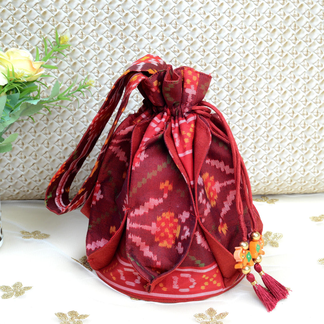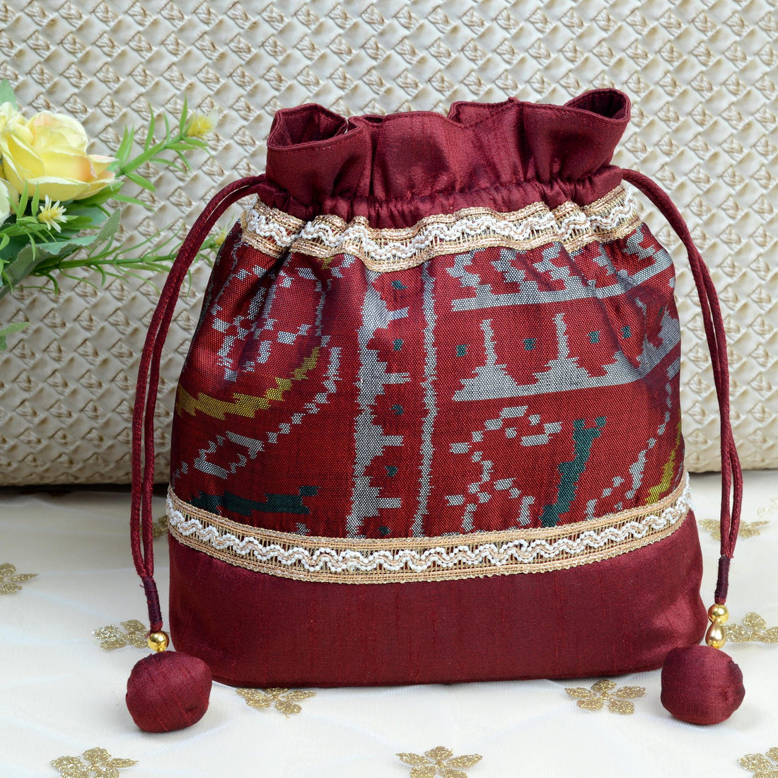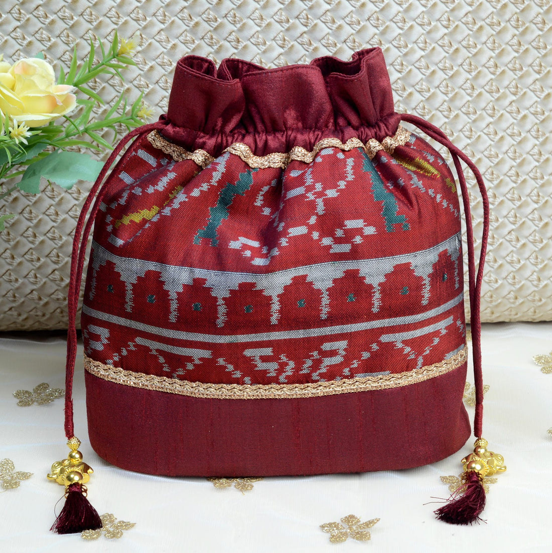 Design : Its in traditional Patola Motifs Batwa : Single Ikat Patola BatwaBase Color : Maroon...