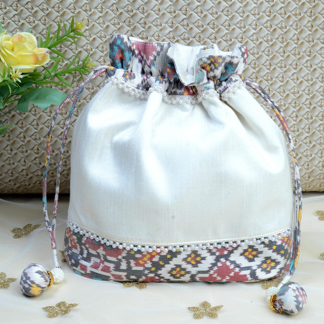 Design : Its in traditional Nau Ratan Batwa : Single Ikat Patola BatwaBase Color : White...