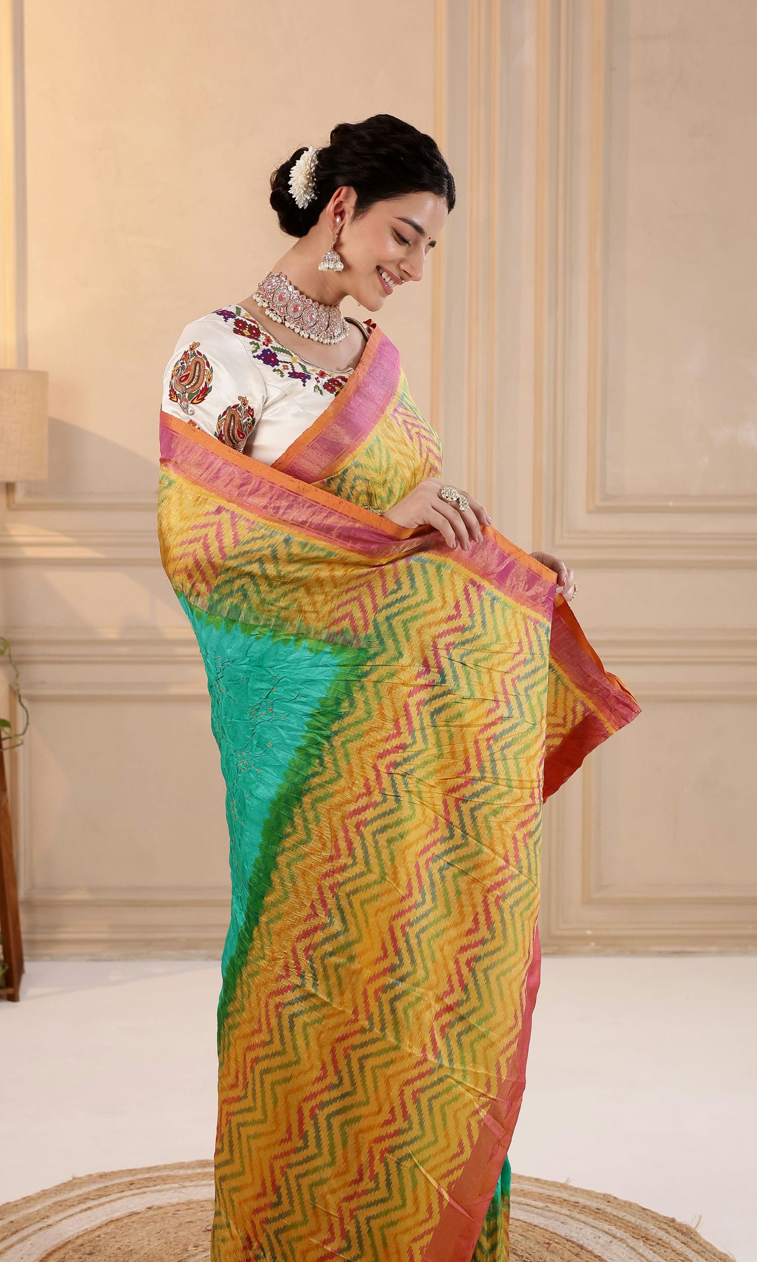 Design : Its in traditional Laheriya Rajkoti Border Pallu with Bandhej in base
